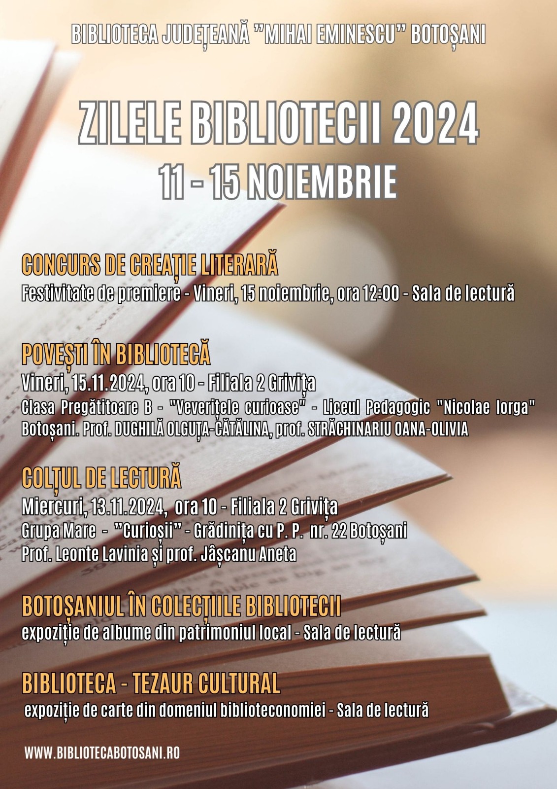 Biblioteca Județeană „Mihai Eminescu” Botoșani anunță o nouă ediție a „Zilelor Bibliotecii”, o săptămână de manifestări culturale dedicate comunității botoșănene și iubitorilor de carte. Seria de evenimente va debuta luni, 11 noiembrie 2024 și va culmina vineri, 15 noiembrie 2024, cu festivitatea de premiere a concursului de creație literară.